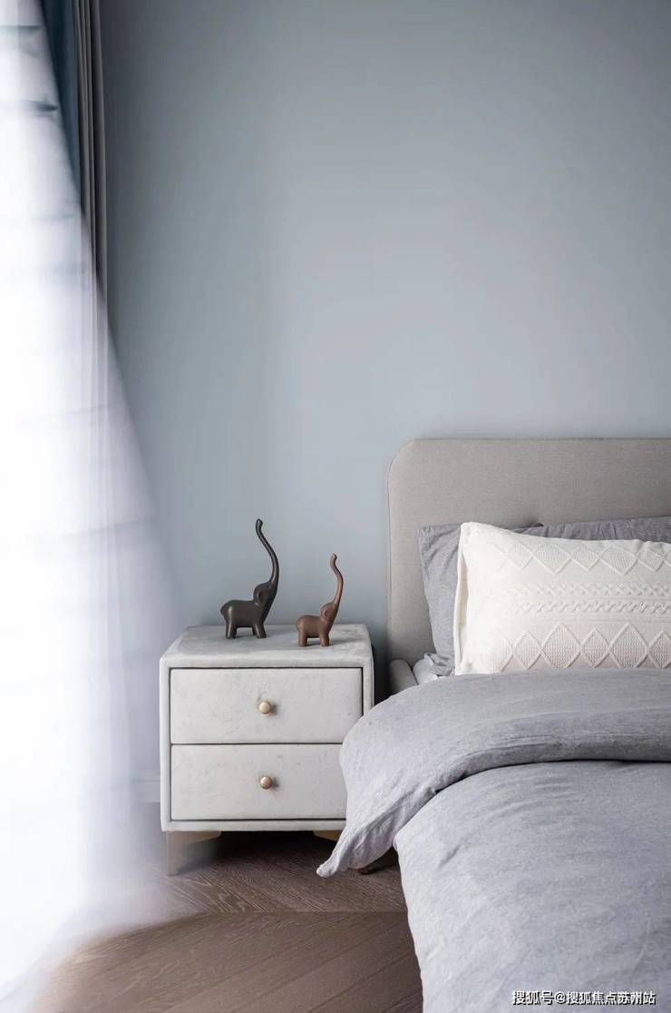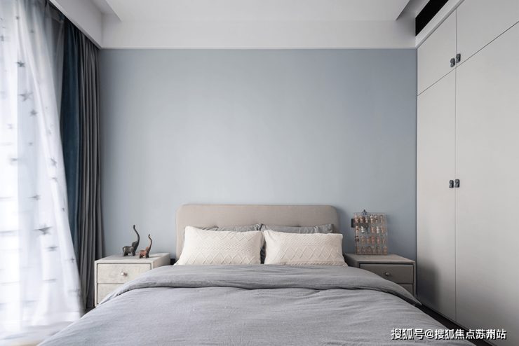 次卧儿童房则采用了低饱和度色彩搭配,浅蓝色背景墙搭配浅灰色床品,充满童趣的星星纱帘搭配灰蓝色窗帘,通顶柜体设计实现完美的储物空间,干净简洁。
