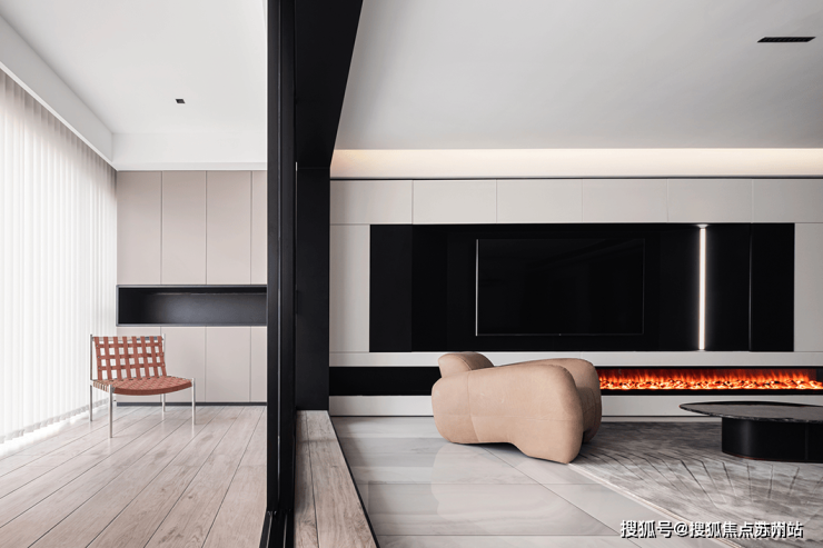 黑白配色的电视背景墙将壁炉纳入这块空间,使得本身冷色调的家瞬间温暖而治愈。