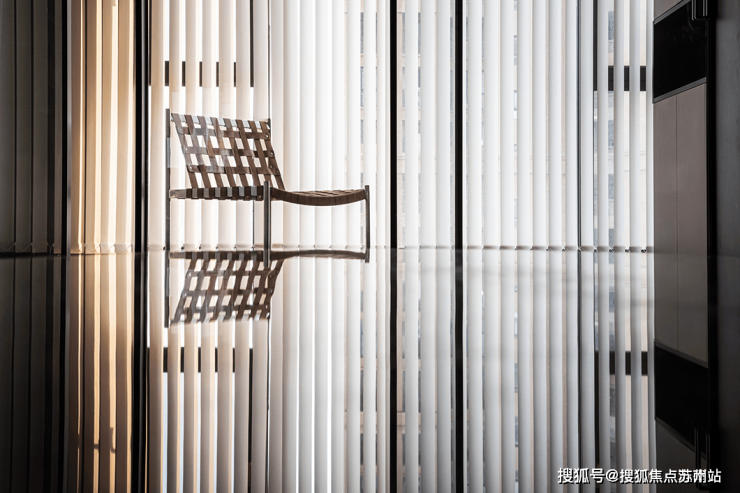 垂直百叶窗将透过大落地窗照进家中的光线均匀切开,营造出光影的效果,既保证了充足的光线又有效保证了隐私性。