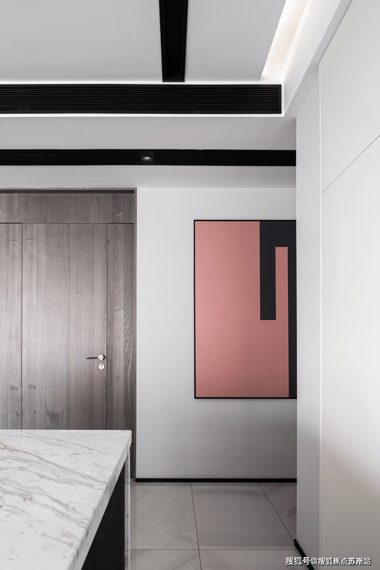 餐厅视角尽头是中厨,利用了隐藏式推拉门设计阻挡了油烟,内部整体色调依然以黑白为主。过道墙壁精心设计为收纳空间,最大限度地利用了每一块空间增强收纳功能。
