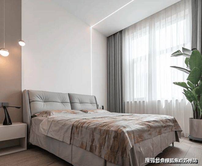 床头背景墙的设计简洁而富有巧思,融城怡园售楼处电话☎:400-882-8814(预约热线)✔✔✔一弧直角灯带的融入,不仅提升了空间的高级感,更为卧室营造出一种温馨而宁静的氛围。暖色光源的巧妙运用,让木饰墙面在光影的映照下展现出更多细节与质感,为整个卧室空间增添了一抹温暖的色彩。这种设计既体现了现代家居的简约风格,又满足了人们对舒适与品味的追求。