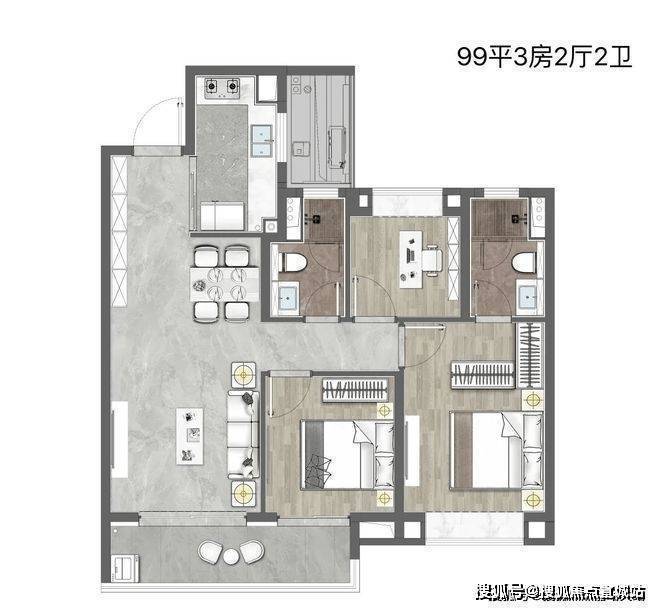 大面积的套房尺度,大尺度进深、从容有余的居住空间,奢阔飘窗、独立卫浴配置,打造尊崇的奢雅体验。百平米内的不将就三房,实现房间数量及空间尺度的均好平衡。