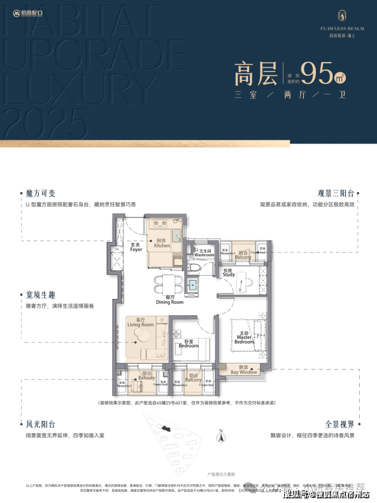 再加上南向大面宽短进深、全卧飘窗、L型转角阳台设计,哪怕小户型95㎡3房,尺度感都超棒,采光和视野更是一流。