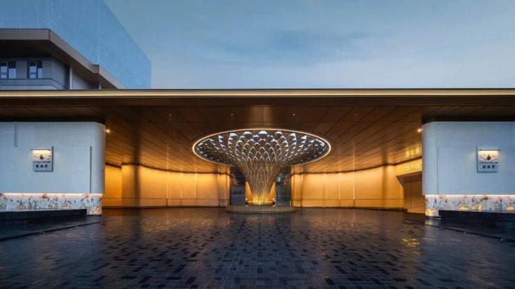 约250米长的超长景观墙界面,以及42m宽、4.8m高的仪式感门厅,入口采用酒店式环岛落客,中心设置寓意「天下四聚」的艺术装置,不仅展现出归家的蕴贵门面和仪式感,还与苏扇工艺打造的黄金池底基座互相辉映。