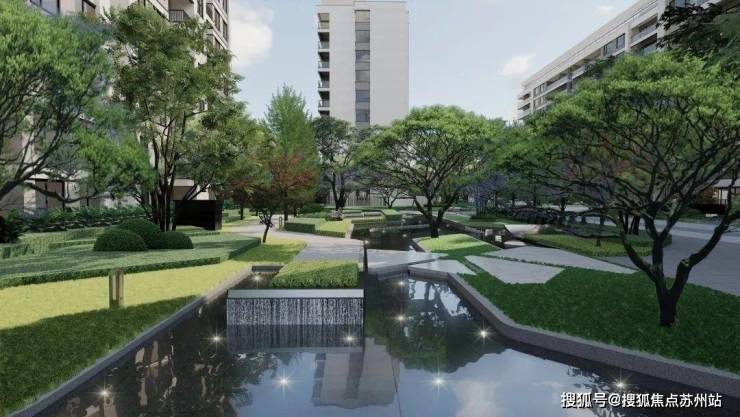 园区景观理念以城市脉络中的延续”胥江“的城市自然空间结构,苏州格局”依水而生,项目天赋人文生态,结合“《胥江流年 姑苏雅居》的设计主题,打造自然与人情交相辉映的水岸生活画卷。