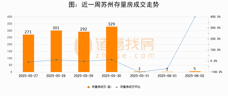 从存量房来看,2025年06月02日苏州存量房单日成交5套,比昨日增加4套,环比上涨400%。从近一周存量房成交来看,苏州存量房日均成交套数为171套,06月02日单日成交5套,低于近一周平均水平97.1%。