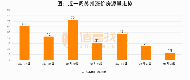 根据诸葛找房数据显示,苏州24小时涨价房源量为13套,较06月01日减少12套,环比下降48%。与此同时,涨价房源占比小幅回落,对于购房者来说是一个入市窗口期,购房者可抓住时机入市。