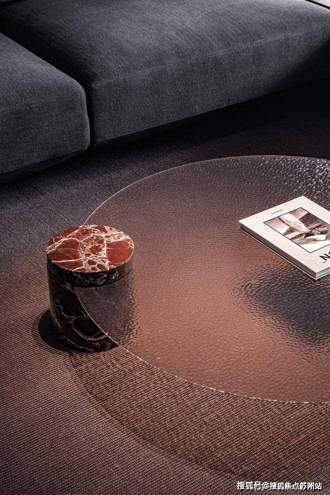 磨砂材质的茶几桌面在黄色灯光的晕染下,逐渐染上了夕阳的浪漫,为室内注入了更多的诗意美好,这种浪漫一圈圈地扩散到了家的每一个角落中。