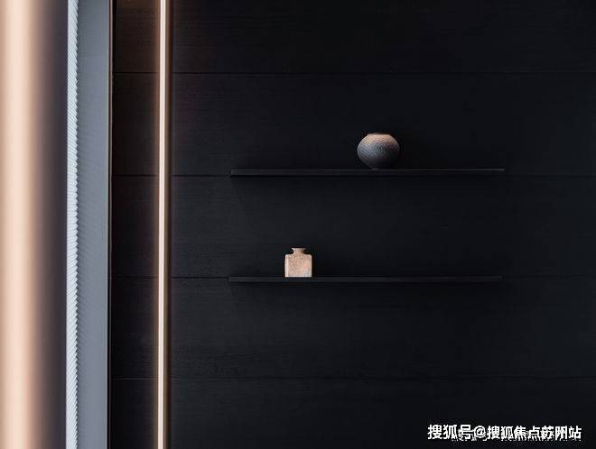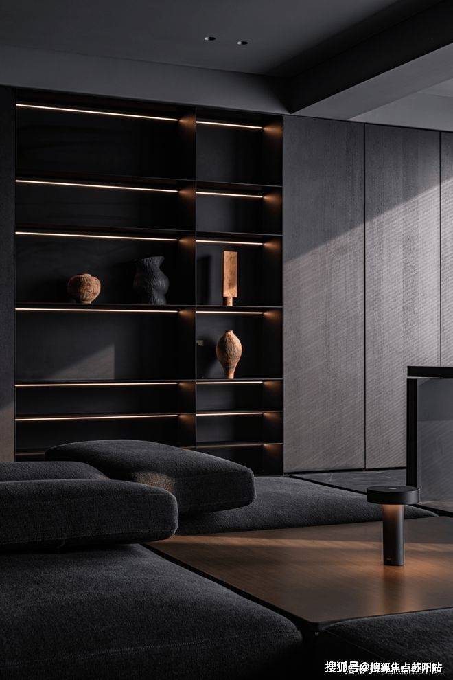 黑色所代表的并非是绝望和深渊,黑色在这个室内象征着宁静和整洁,以高度的统一感创造空间的和谐,打造了高品质的居所,规整的沙发、地毯以及嵌入墙体的壁龛,都汇集于此,用品质诉说着家的整洁。