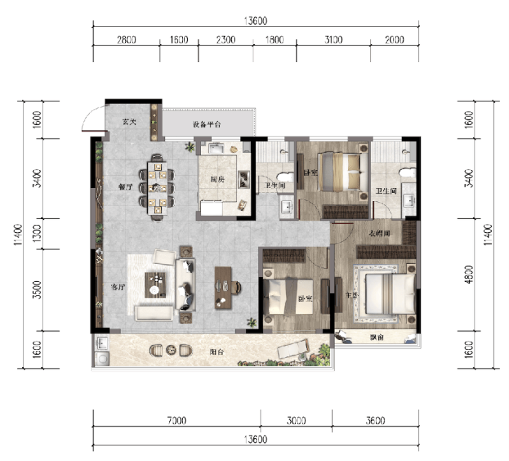 四开间朝南,约13.6m超大面宽+超大无柱横厅,拥有近34㎡的客厅面积,这才是豪宅格局.