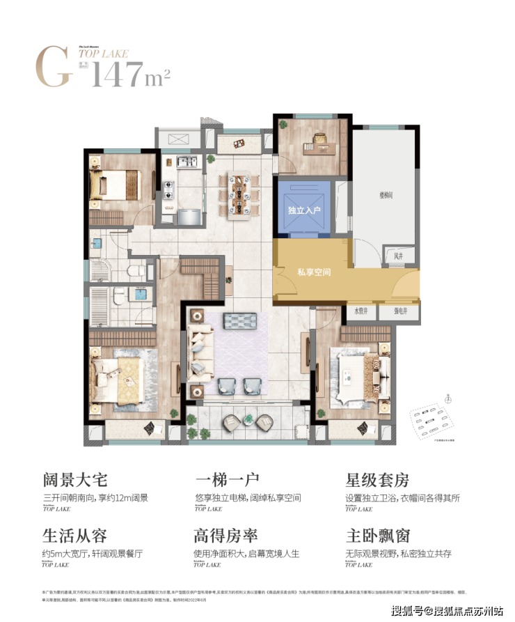整个户型南北方正,并且一梯一户,约5米观景阳台、三开间朝南.....即便是在苏州市场上的同类产品,这样的布局也是难得一见的所在。