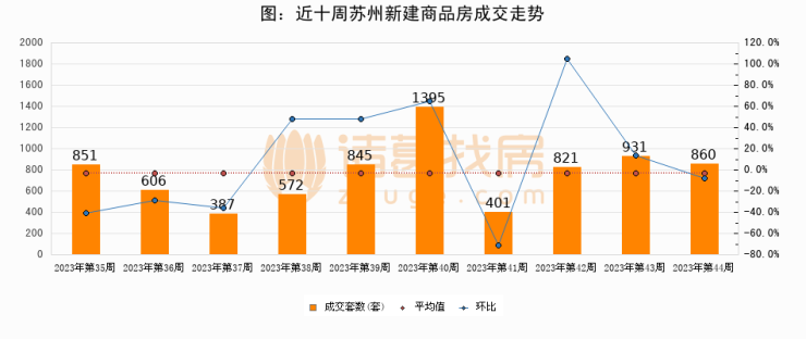 进入2023年第44周(10月23日-10月29日),苏州新建商品房成交860套,较上周减少71套,环比下降7.6%