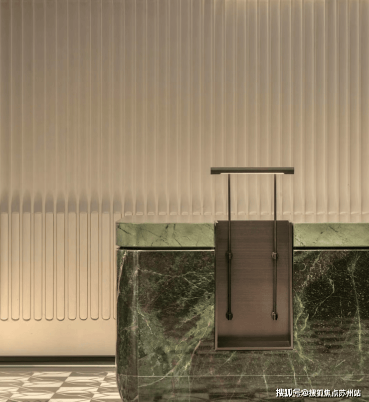 黑白交织的网格地块将“步入其中”的质感体验表达得更加生动而有韵律。入口处的吧台作为空间的基石,沉稳的翠意散发着生命力,起到承上启下的关键作用。