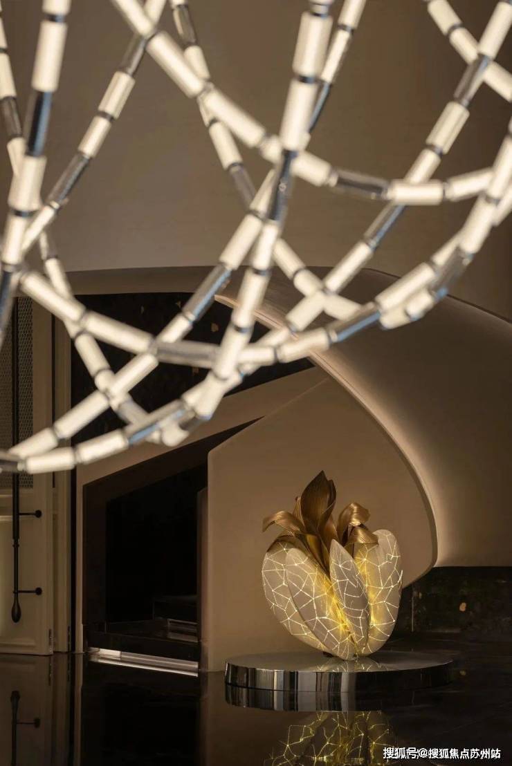 经纬交织,月映千年。绛丝工艺被应用于空间的吊灯之中,设计师力图通过非遗传统,不生硬地创建时间与空间的相对关系,突破经典设计中对于历史的平铺直叙。