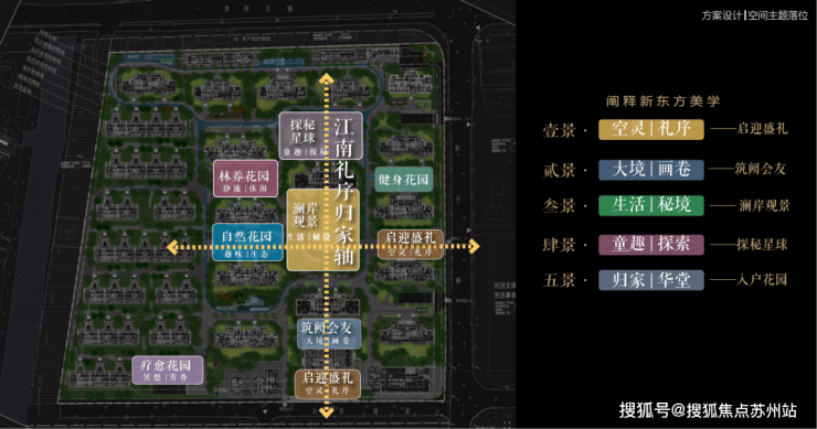 以江南人文精神为源点,打造两轴一环五进空间,江南礼序归家轴串联启迎盛礼、筑阙会友、归家华堂等5重礼制,尊崇归家;健康运动轴以24小时跑道为社区活力生活环,串联儿童乐园、长者康养、疗愈花园等10大生活场景,营造全龄全时的江南诗意生活