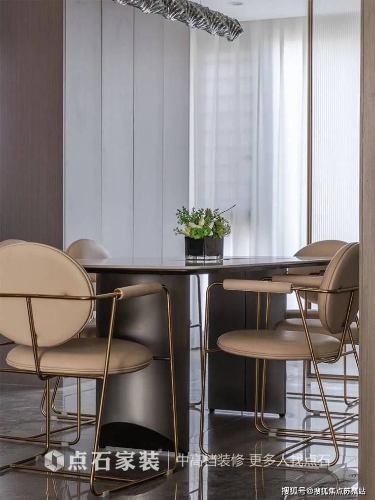 在这里随处可见元素拼接呼应,浅色系的应用更是让餐厅视觉上显大。在光的反射作用下,餐椅的黄铜框架熠熠生辉,造型极致简约,尽显轻奢大气!