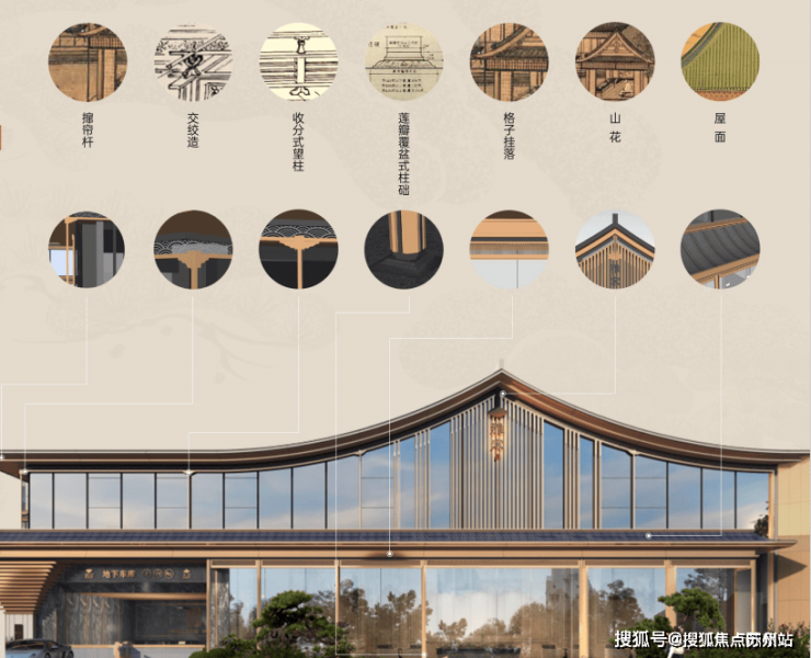 研习《营造法式》之精巧,提取宋朝代表性建筑中的中式重檐屋顶、木作构件元素,甄选铝板、石材、LOW-E玻璃为主材,打造简雅秀逸的宋风公建化立面。