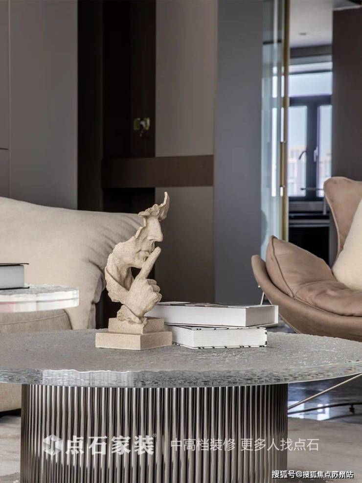 以灰为空间主色调,可见木饰面、格栅、岩板的大面积应用,增加空间视觉层次的同时,也在调和与之相适配的轻奢质感。