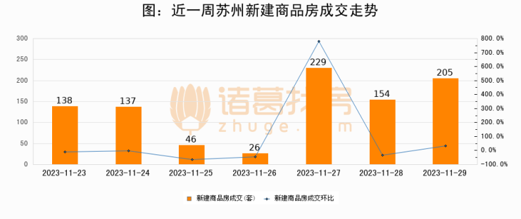 根据苏州市房地产市场和交易管理中心数据显示,2023年11月29日苏州新建商品房成交205套,较昨日增加51套,环比上涨33.1%。近一周苏州新建商品房日均成交134套。11月29日单日成交205套,高于近一周平均水平53%。