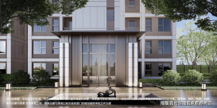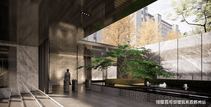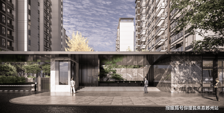 社区大门完全区分人行、车行入口,人行入口采用石材与玻璃搭配设计,大气恢弘!门厅景观水院精致高级,入户仪式感满满!