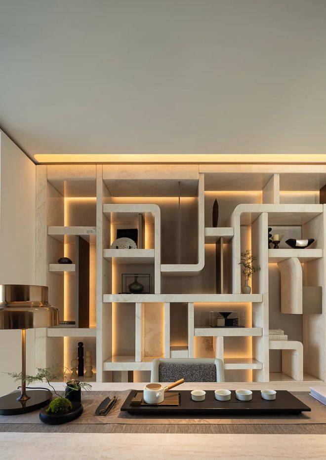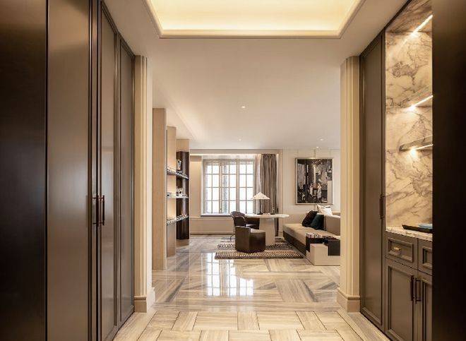 ✅万科中興傲舍营销中心热线4008123664(官方预约看房热线)进入室内的入户玄关收纳空间,地面采用静雅棕、宝格丽兰石材拼花设计古典回形波打+实心铜条的搭配增强入户尊贵感。右侧是山水白奢石的开放格,左侧是行李间,通过暗门的做法,将功能结合进去,强化了归家的仪式感。