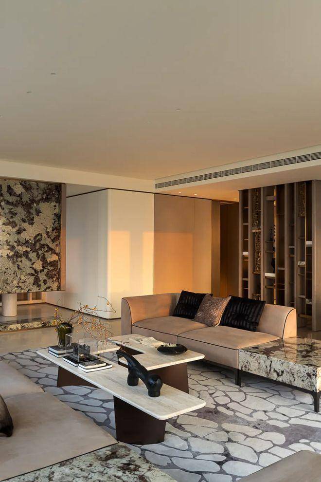 电视背景墙,采用巴西利亚石材,石材内含金线,在不同的灯光照射下,会呈现不同的视觉效果。