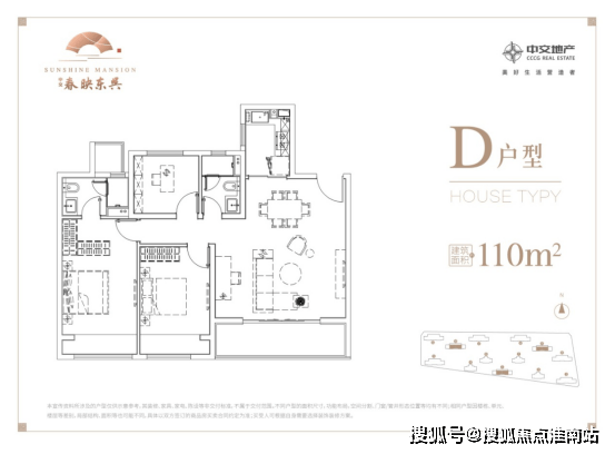 ▲户型点评:110㎡三室两厅两卫,南向横厅设计,采光充盈;宽尺双厅,公共区域
