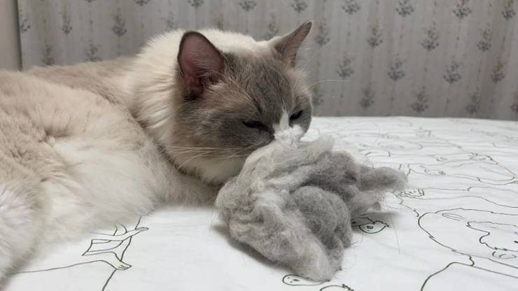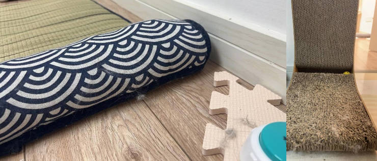 而猫犬的生理特点和天性也给维持洁净的家居环境带来很多挑战。“小咪胆子很小,很警觉聪明,一有风吹草动就会四处钻洞躲藏,Maji就很亲人,我在床上看书追剧,它总是会跳上来滚一滚蹭一蹭。所以我家的猫毛分布很能体现它俩的性格特征和活动轨迹,床褥沙发上一年四季都粘着Maji的长毛;冰箱和橱柜的缝隙、床底这些意想不到的地方更为常见的就是小咪的黑白双色毛。养猫之前,没有猫毛预警,我都想不到家里有这么多容易藏污纳垢的清洁死角。”为了照顾好这个“二猫家庭”,凯西提高了自己深度整屋清洁的频率,“太难了,三天一小扫、五天一打扫也很难根除这些猫毛。”