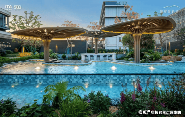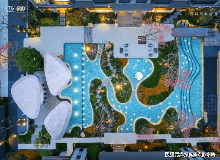 踏入中央景观区,映入眼帘的是一座占地大约1600平方米的度假酒店岛屿。岛内生长着约50年历史的乌桕树,营造出海岛风情的层叠水池和细水长流,勾勒出一种优雅放松的生活氛围。三套海上花园风格的廊架,其设计灵感来源于海洋贝壳,为林间休闲空间增添了一份独特魅力。
