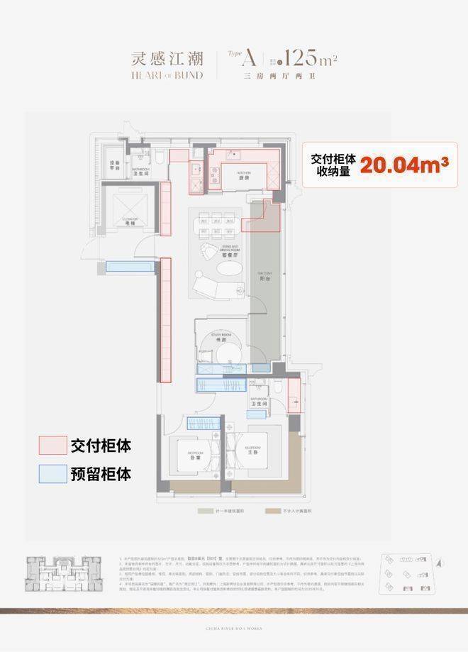 据小胖君手工统计,项目125㎡3房边套户型的整体交付柜子+预留衣柜,收纳空间可以达到约20.04m³,中间套户型也能达到约16.56m³!澐启滨江售楼处电话☎:400-8673-567【预约☎】