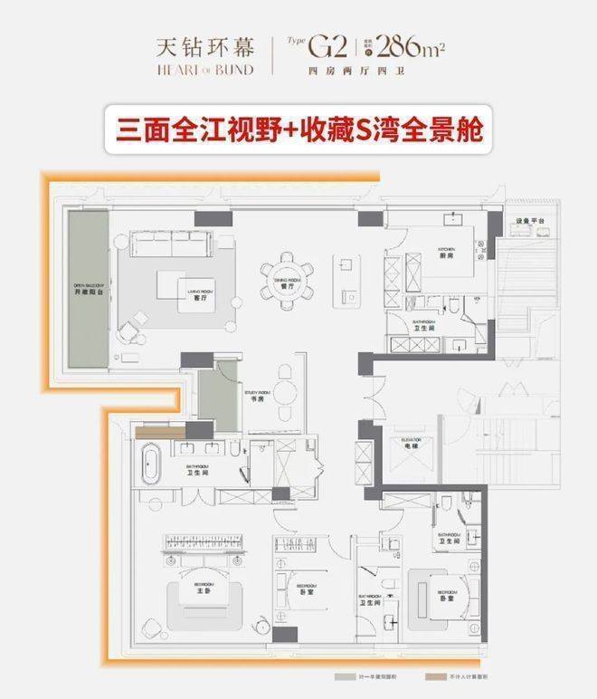 而且2号楼直面S湾,建面约286㎡户型又是三面看江,视野更加震撼!