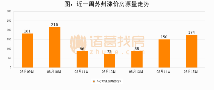根据诸葛找房数据显示,苏州24小时涨价房源量为174套,较08月14日增加24套,环比上涨16%。与此同时,涨价房源占比小幅扩大,业主信心有所提升。