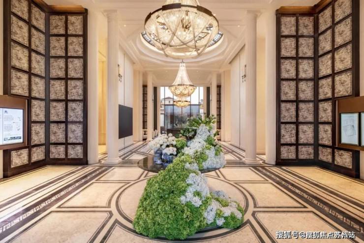 预接待厅地面瓷砖采用 威尼斯白 与 爵士白石材拼花 设计,纯人工铺装保证花纹的奢华质感。