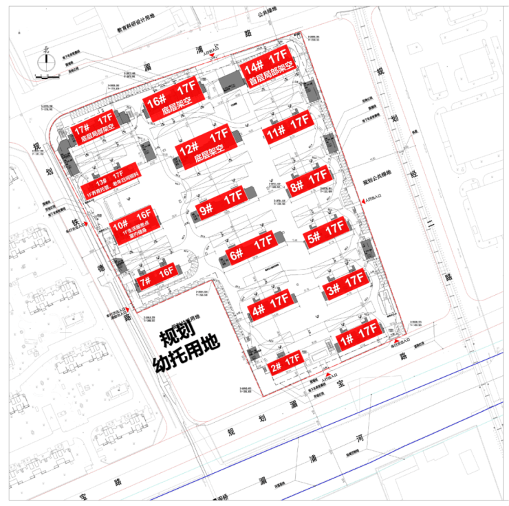 根据设计方案显示,地块拟建16栋16-17层高层住宅,以及社区配套,可售住宅体量超过1100套。