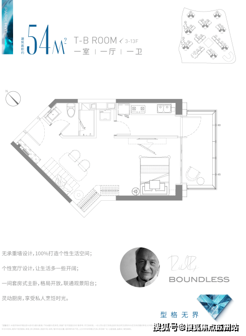 建筑面积约54㎡1房,之前几乎没有同类产品,非常适合预算有限,在市区工作的首套刚需客,约280w+就能上车。