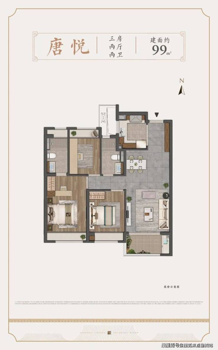 约99㎡3房2卫,汇聚了市面上优秀户型应该有的大多数特质.