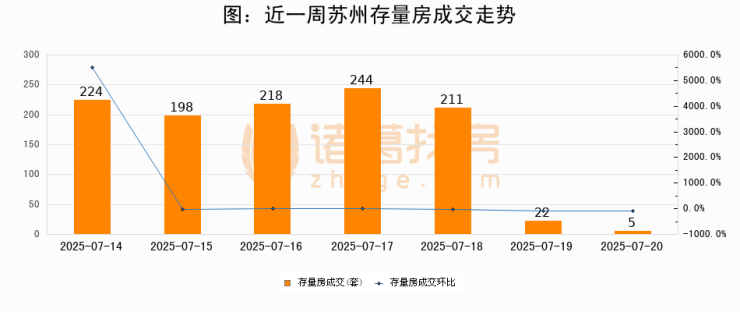 从存量房来看,2025年07月20日苏州存量房单日成交5套,比昨日减少17套,环比下降77.3%。从近一周存量房成交来看,苏州存量房日均成交套数为160套,07月20日单日成交5套,低于近一周平均水平96.9%。