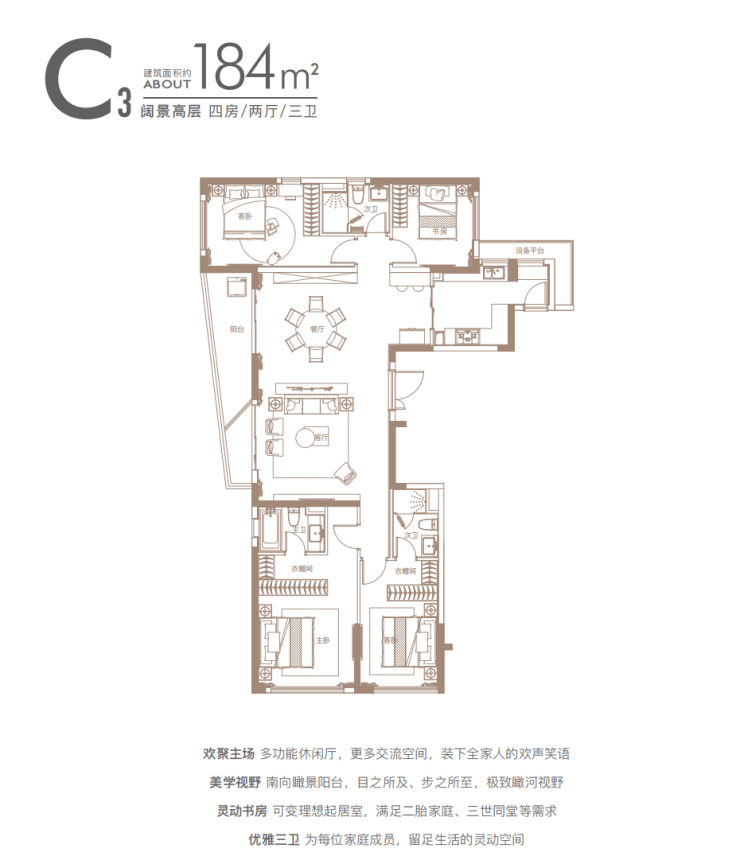 独立玄关、U型厨房、主卧大套间、三开间朝南大面宽等均为标配,堪称140㎡段的“完美四房”。