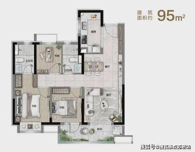 建面约95㎡户型不仅集合了85㎡户型三开间朝南、三房设计的优点,主卧还带有独立卫生间和步入式衣帽间,保障了主卧的私密性。