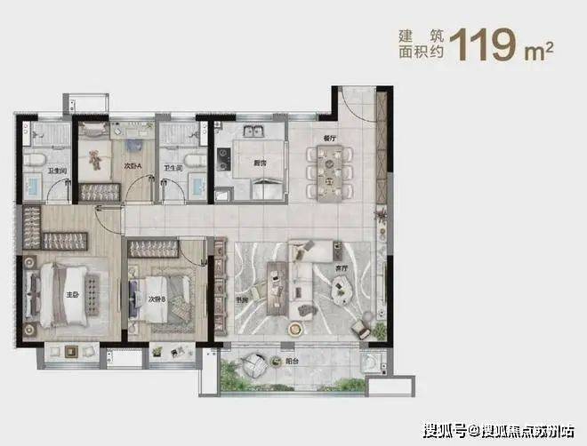 ▲建面约119㎡户型亮点更是显而易见,大横厅加大面宽阳台,这样的设计带来大平层与别墅才有的居住体验,四房两厅两卫,置业一步到位,适合成长型家庭。