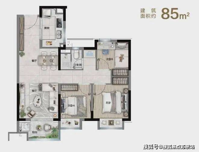 ▲建面约85㎡户型三开间朝南,采光充足,布局了三房,且卫生间为干湿分离布局,方便了日常起居生活,这样的设计对于二胎家庭来说十分友好。