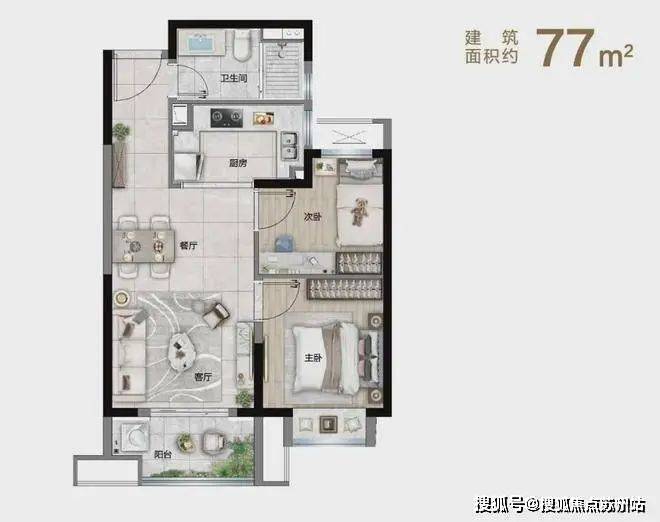▲建面约77㎡户型布局紧凑,南北通透设计,主卧、客厅均朝南,采光充足。控制了面积、大大降低了置业门槛。