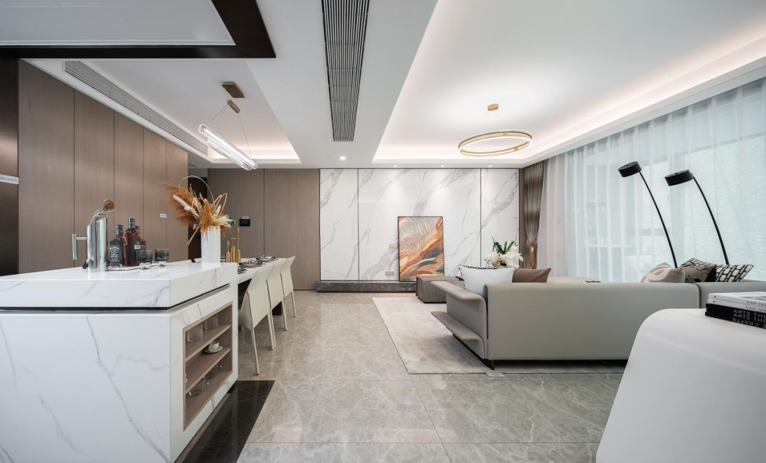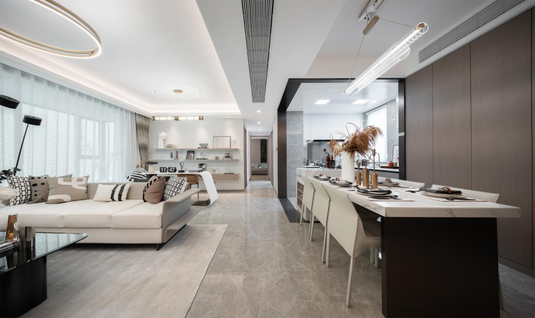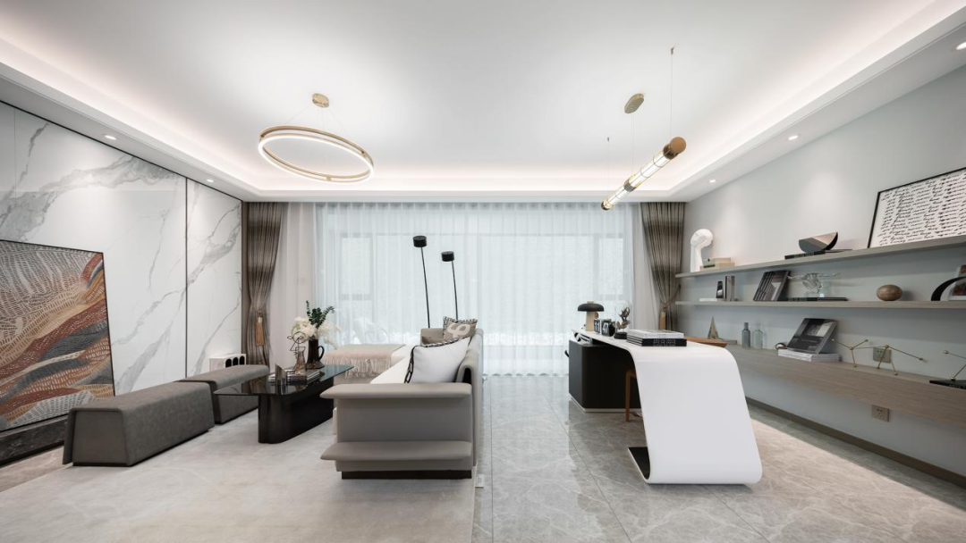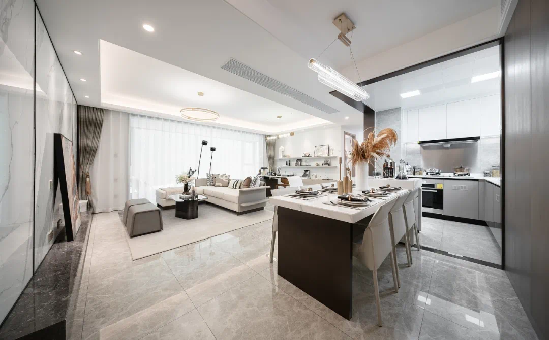 在以横厅为中心的家庭核心社交区,除了餐厨一体联动空间,客厅社交空间,更惊喜的留出一个“第三厅”区域,让家有足够的延展可能。全家的健身运动区,亦或区别于客厅的开放式书房,再或者情调满满的吧台,甚至作为孩子幼时全家的亲子互动中心……第三厅的空间呈现,一切尽在想象。