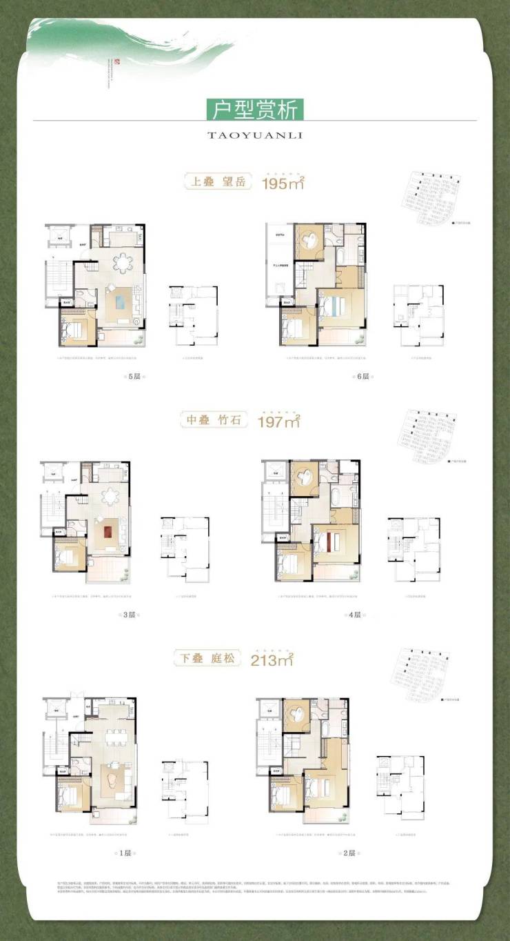 有两种顶级产品。一种是 宋风叠加,建面约195-213㎡。它把宋代的美学韵味和现代叠墅结合,有能框住风景的大窗、简约现代的立面设计、体现礼序的屋檐细节,既古典又时尚,是追求品质生活的理想选择。