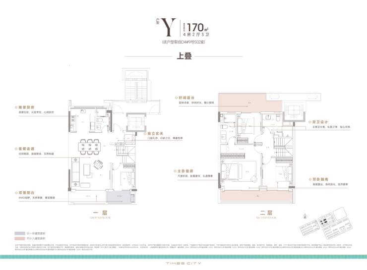 上叠产品创新采用 南北双露台+南向双阳台布局, 270度全景采光面让室内外空间完美融合。边套户型的1楼客餐厅和2楼主卧,更增设侧飘窗,将社区美景尽收眼底。