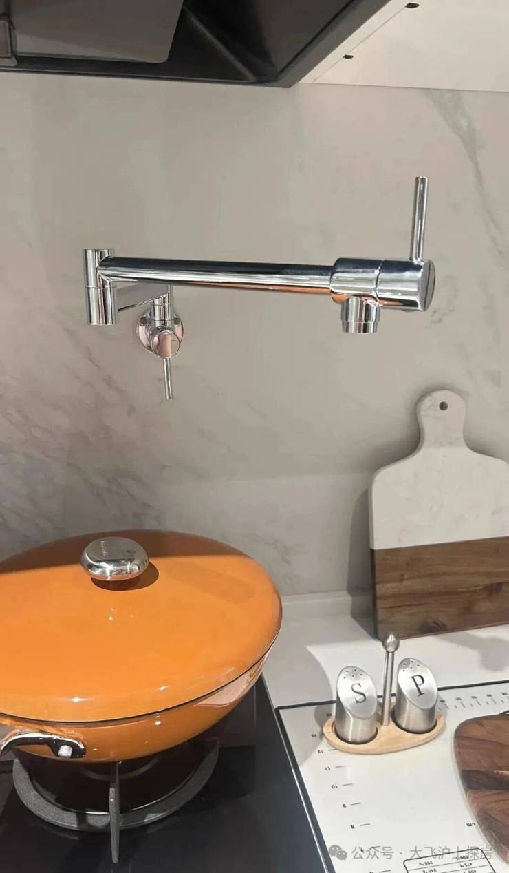 厨房超大柜体的收纳空间,包括调味拉篮、岛台双面收纳,将厨房空间直接扩容约80%,贴心的灶前龙头设计,开火时直接上方接水,非常灵活;
