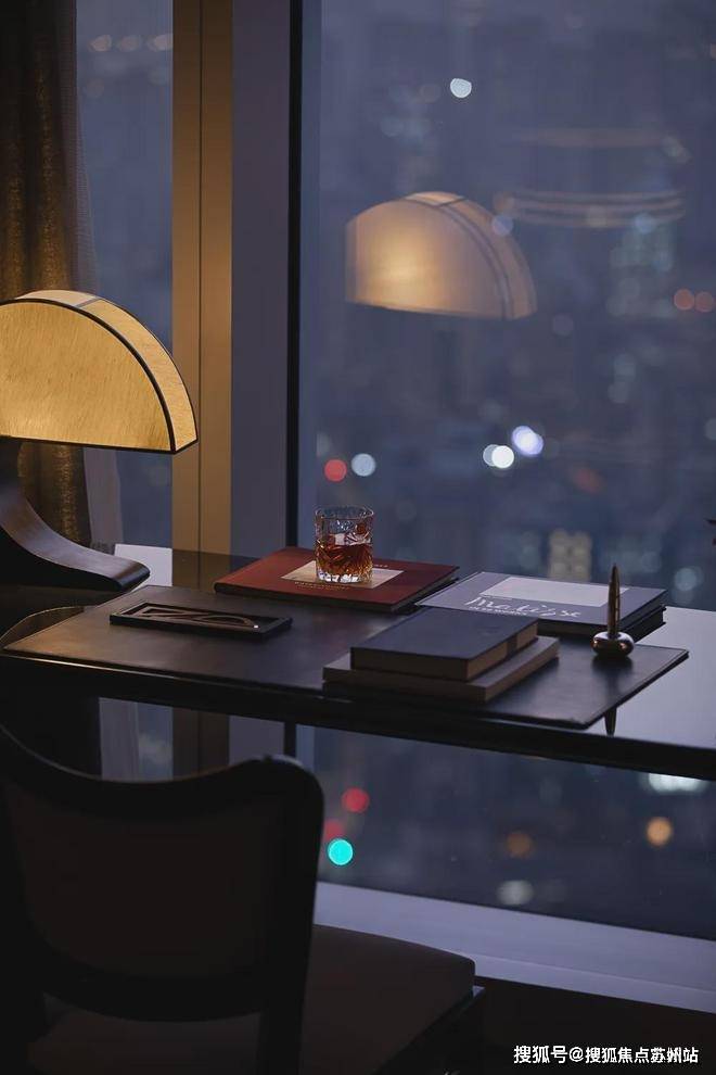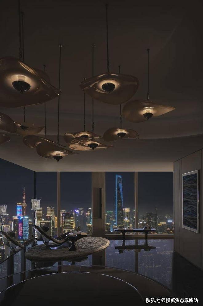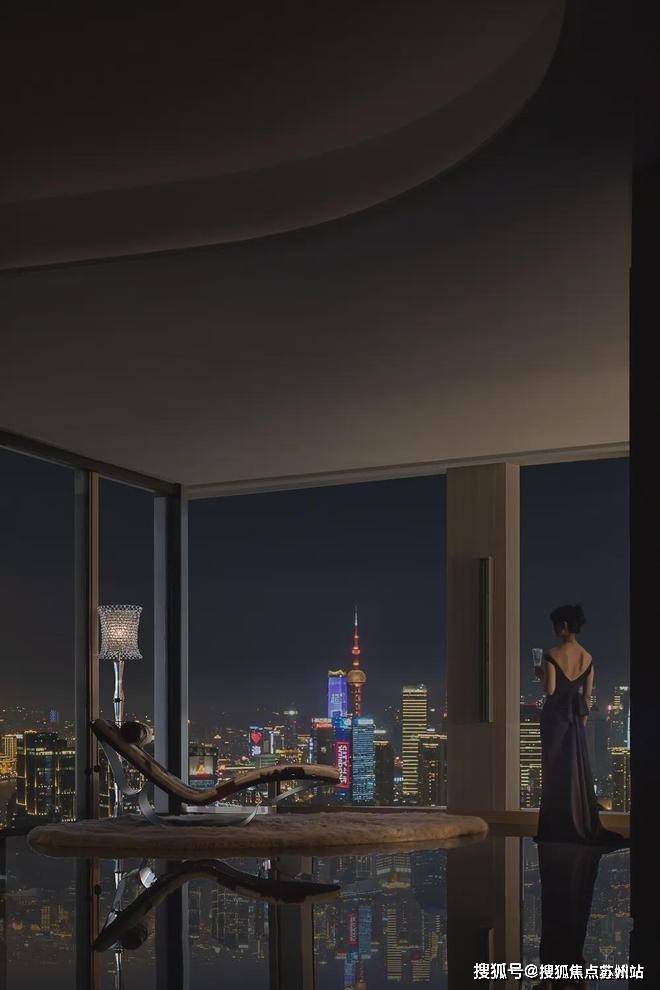 走道端处香槟色金属雕塑,形类城市高楼,又若恋人彼此依偎;全采光套房拥揽白日上海黄浦的忙碌、繁华,也收藏夜晚灯火阑珊的宁静、美好。