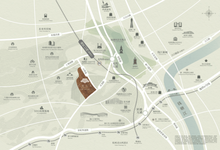 此外,从大杭州地图上就可以看出,龙坞向东对望钱江新城,向南是滨江-奥体,向北是未来科技城-云城,恰好是三大城市中心交汇的正C位。入则宁静,出则繁华,这种居住氛围,在杭州再难找到第二处。