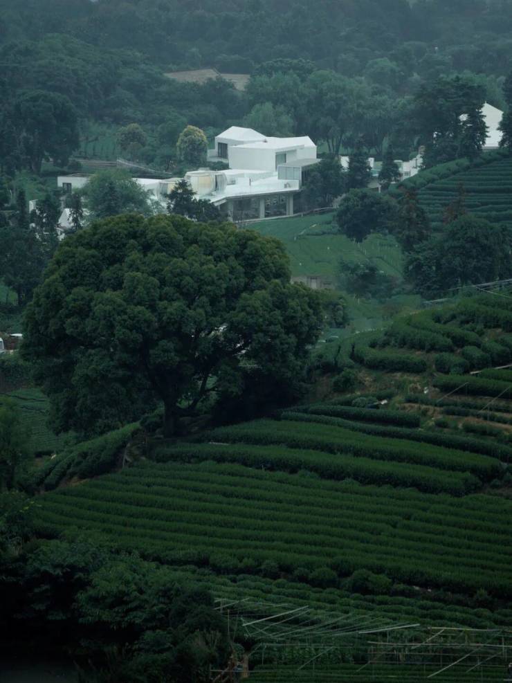 大坡顶+小坡顶结合,与台地呼应。再将茶山的脉络线条镶嵌在屋檐上,屋面采用瓦片材质与金属钩边铺装,青瓦交叠,蕴藉着江南诗意。