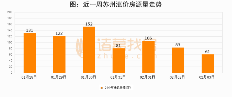 根据诸葛找房数据显示,苏州24小时涨价房源量为61套,较02月02日减少22套,环比下降26.5%。与此同时,涨价房源占比小幅回落,对于购房者来说是一个入市窗口期,购房者可抓住时机入市。